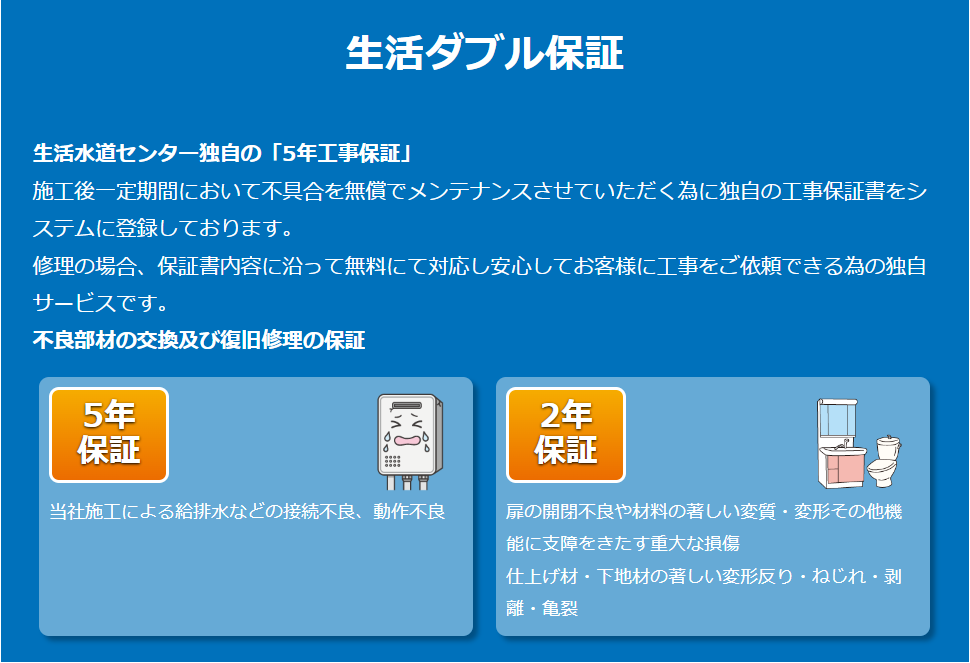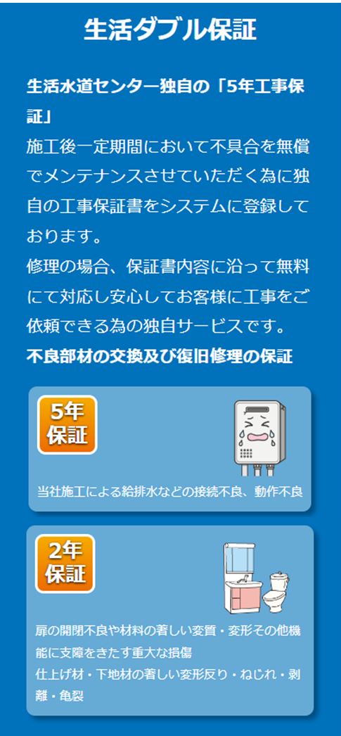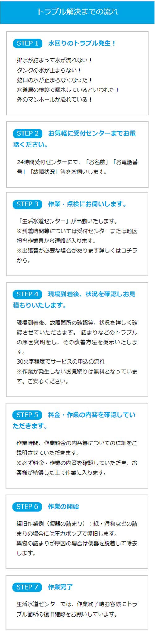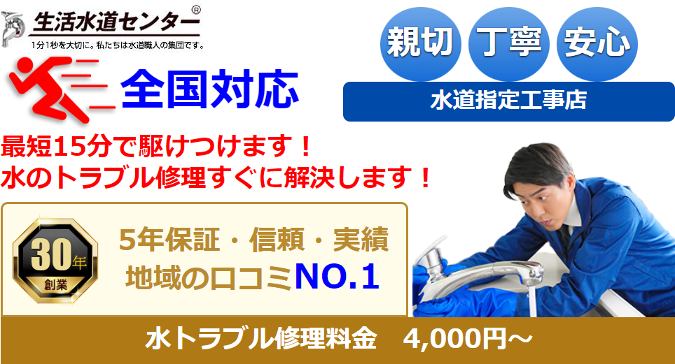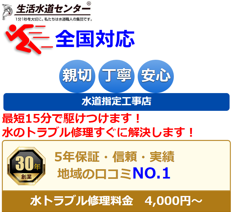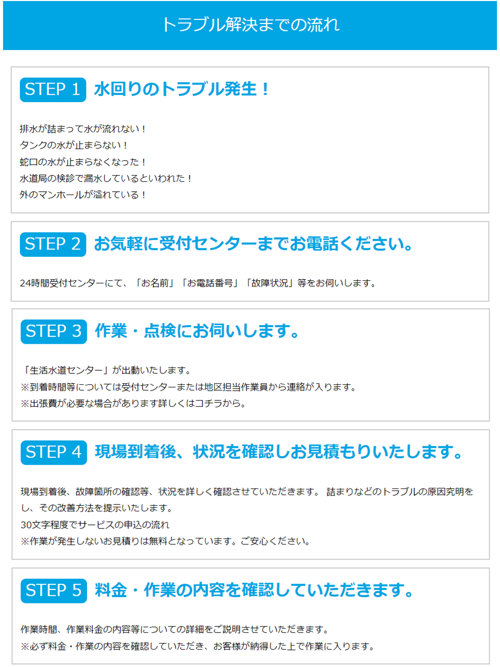 親切、丁寧、そして安心をモットーに施工しています。水のトラブルが急に起こっても慌てず、生活水道センターにご相談ください。安心してお任せいただけます。