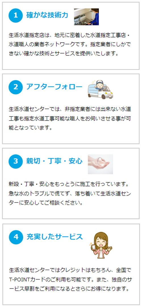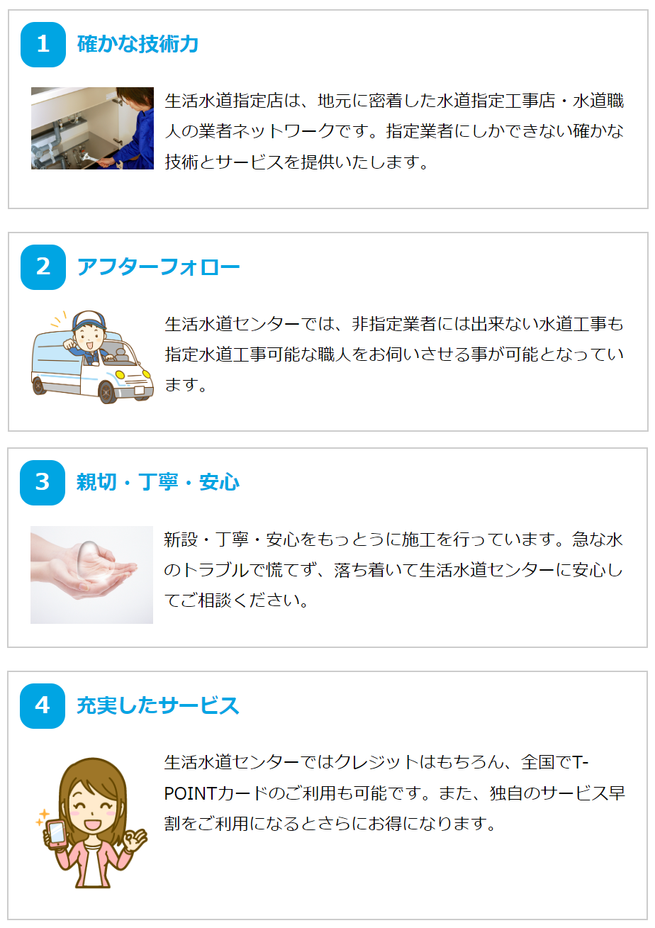 生活水道指定店は、地元密着型の水道指定工事店および水道職人の専門ネットワークです。指定業者だけが持つ高い技術力と充実したサービスをお届けします。