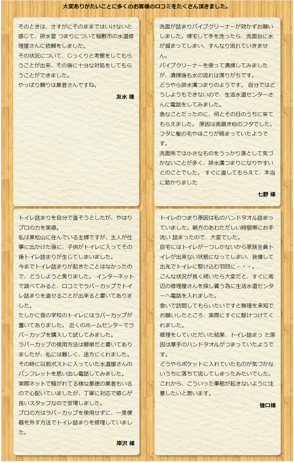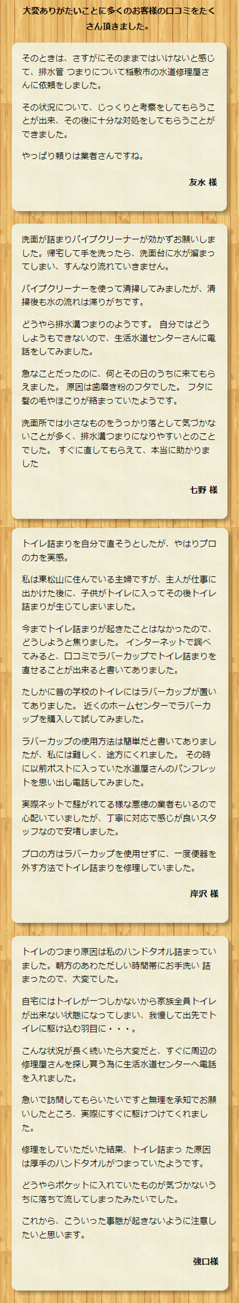 私たち水道局指定の工事店は、長年にわたり漏水修理を手掛けてまいりました。充実したサービスをお客様に提供することを心掛けています。その一心で、お客様へのサービスを提供してまいりました。これからもどうぞよろしくお願いいたします。